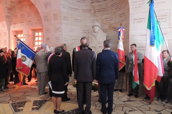 Après le dépôt d’une gerbe devant la statue du Poilu, une cérémonie présidée par Monseigneur Gusching, Président de la Fondation de l’Ossuaire et en présence de Jean-Louis Andrès, Maire de Charnay, Rolf Kieser, Maire de Brackenheim (Allemange), Béla Kovacs, Maire de Tarnalelesz (Hongrie), Carlo Mancuso, Maire de Castagnole Delle Lanze (Italie), Silvia Gheorghiu représentante de la mairie de Tudor Vladimirescu (Roumanie), Wieslaw Olszewski, Maire de Zbroslawice (Pologne), et des instances militaires et préfectorales, a eu lieu au sein de l’Ossuaire.