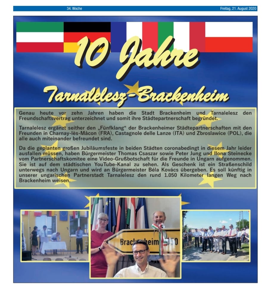 Vor circa zehn Jahren haben sich damals 35 begeisterte Europäer aus Brackenheim auf den langen Weg in den Norden Ungarns aufgemacht, um den Partnerschaftsvertrag zwischen Brackenheim und Tarnalelesz am 21. August 2010 zu unterzeichnen.