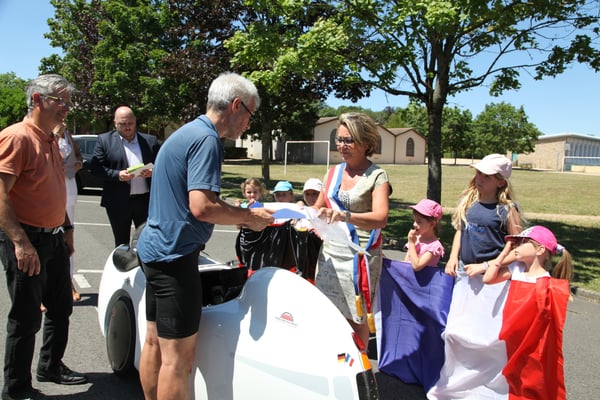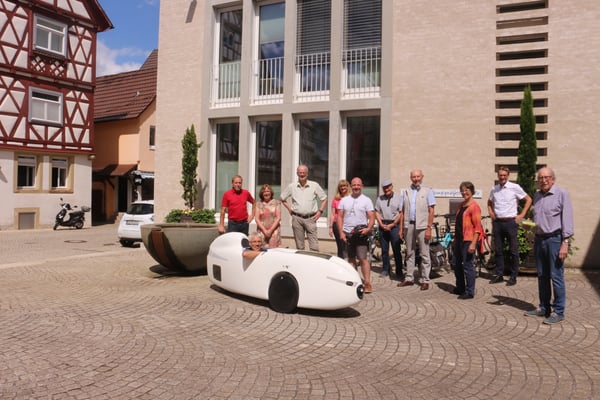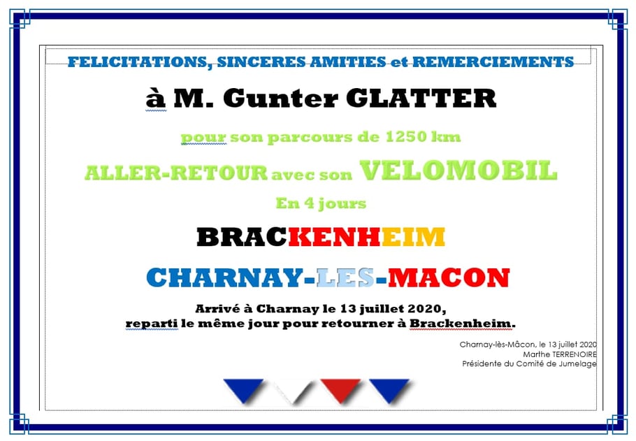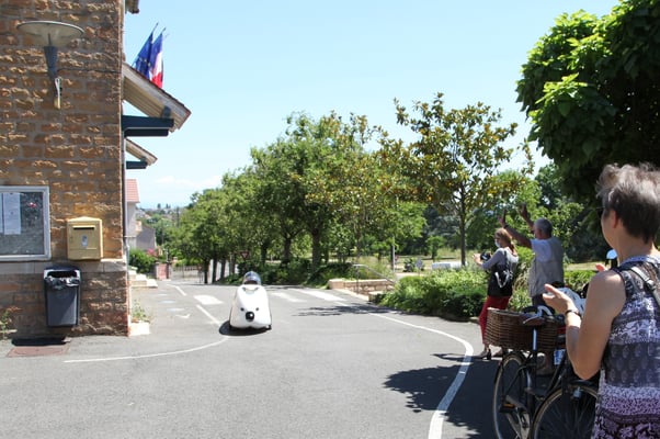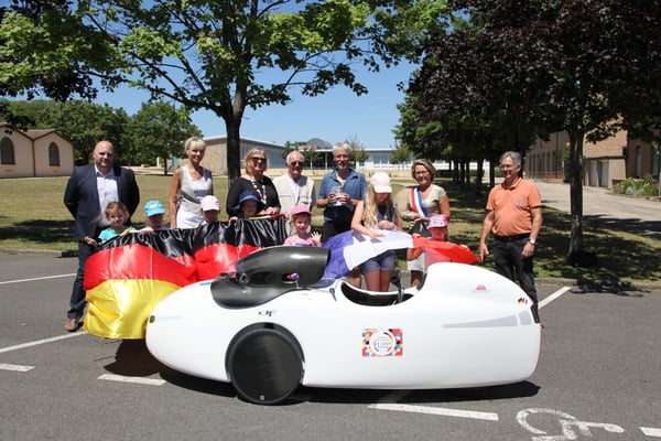 Günter Glatter, ein Fahrrad-Aficionado par excellence, der bereits vor etwa 25 Jahren mit einer Stockheimer Gruppe per Rad Charnay besuchte und Mitglied der Stadtradelgruppe „Tour d’Europe“ des Partnerschaftskomitees ist, die letztes Jahr von Team-Captain Martin Gerhäußer ins Leben gerufen wurde, fuhr in Rekordzeit ins Mâconnais und zurück. 1164 Kilometer in knapp 36 Stunden reiner Fahrzeit! Diesmal jedoch mit einem ganz besonderen Dreirad – einem aerodynamischen Velomobil. Einer Art Liegerad mit ultraleichter Carbonverkleidung und natürlich ohne Motor!