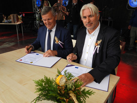 weiterer besonderer Akt: Die Bürgermeister Wiesław Olszewski und Michal Zurbola unterzeichnen den Freundschaftsvertrag zwischen Zbrosławice und dem slowakischen, vormals ungarischen Leles. Eine