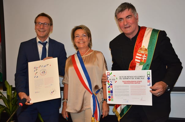 Bürgermeister Thomas Csaszar mit Bürgermeisterin Christine Robin und Bela Kovács beim Unterzeichnen der Urkunde zum 45-jährigen Juiläum.