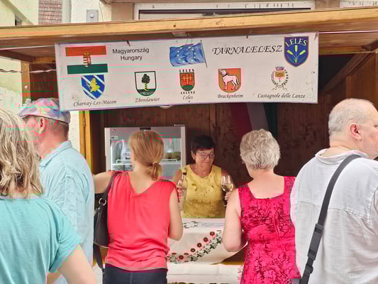 Gestärkt wurde sich anschließend im Bürgerzentrum bei einem Grillbuffet mit Grillwurst und -fleisch, verschiedenen Salaten und Nachtisch. Im Anschluss durften die Gäste ihre Hütten auf dem Weindorf bestücken, worüber sich die Besucher ab 17 Uhr sehr freuten. Crêpes, Wein und verschiedene andere kulinarische Köstlichkeiten - alle aus den Regionen der Partnerstädte - konnten probiert und genossen werden.