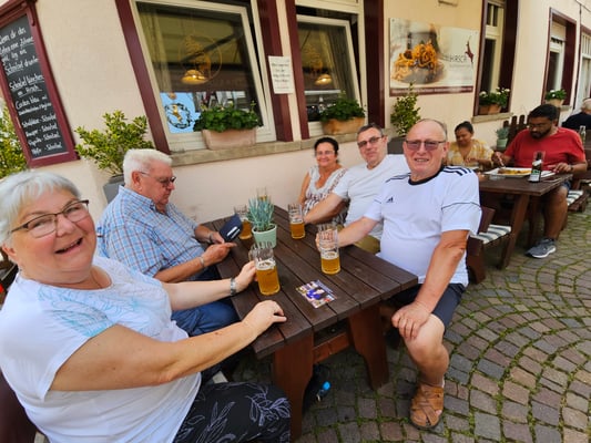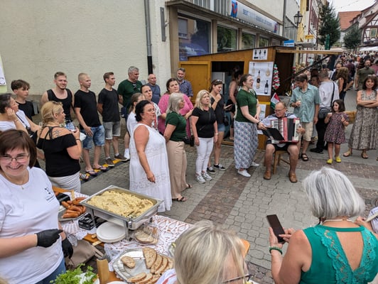 Bevor zum Abschluss des Partnerschaftswochenendes noch kräftig auf dem Weindorf gefeiert werden konnte, betreuten auch am Sonntagmorgen die Gäste ihre Stände. Musikalische Beiträge lieferten die Band "Miedarzanie" aus Zbroslawice und der französische Chor "Feel Good" auf der Bühne auf dem Rathausvorplatz. Ein gemeinsamer Abschluss bildete eine gemütliche Runde Kaffee inkl. Hefezopf und anderer Leckereien im Bürgerzentrum, bevor die Gäste langsam, aber sicher wieder die Heimreise antraten.